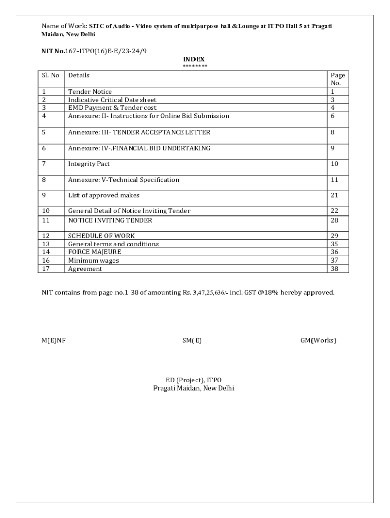 Name of Work: SITE of Audio Video system of multipurpose hall lounge at IPO Hall 5 at Pragmatic Maidan, New Delimit No.167ITPO(16)EE/2324/9 INDEX******** SL. NoDetails1 2 3 4Tender Notice Indicative