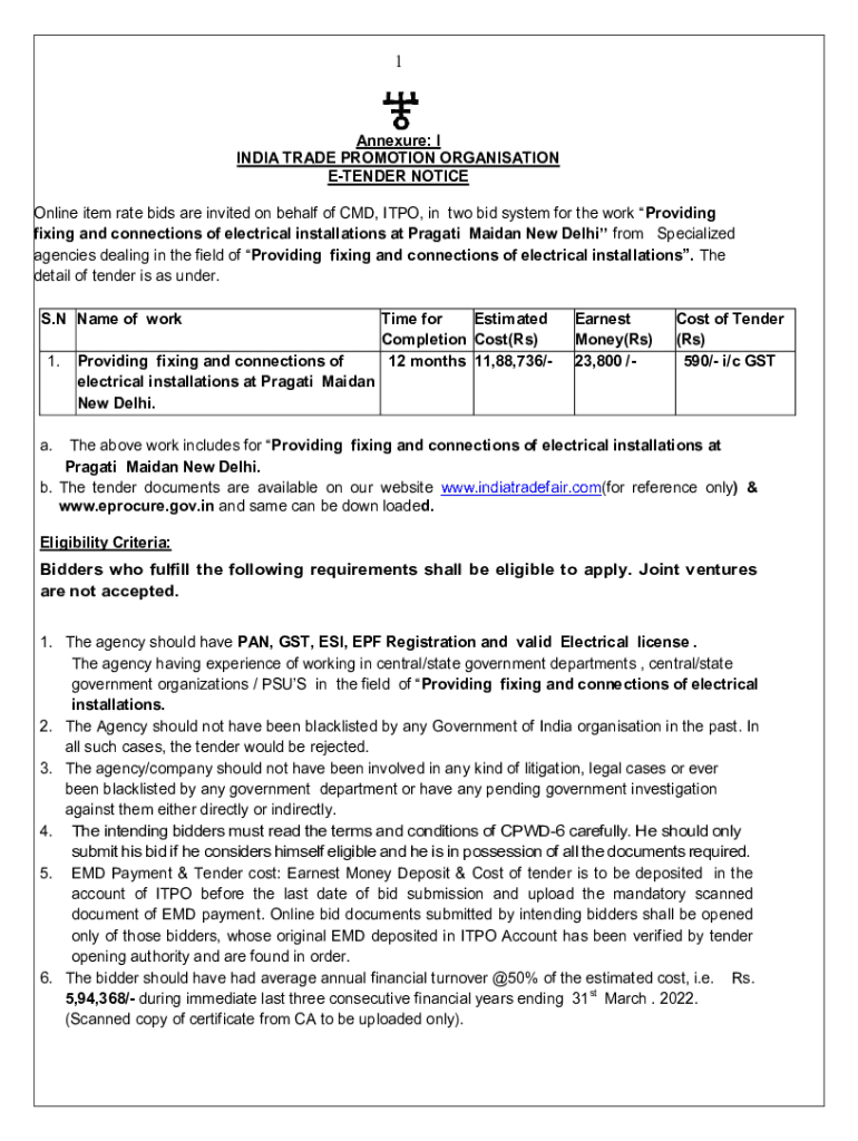 1Annexure: I INDIA TRADE PROMOTION Organization TENDER NOTICE Online item rate bids are invited on behalf of CMD, IPO, in two bid system for the work Providing fixing and connections of electrical