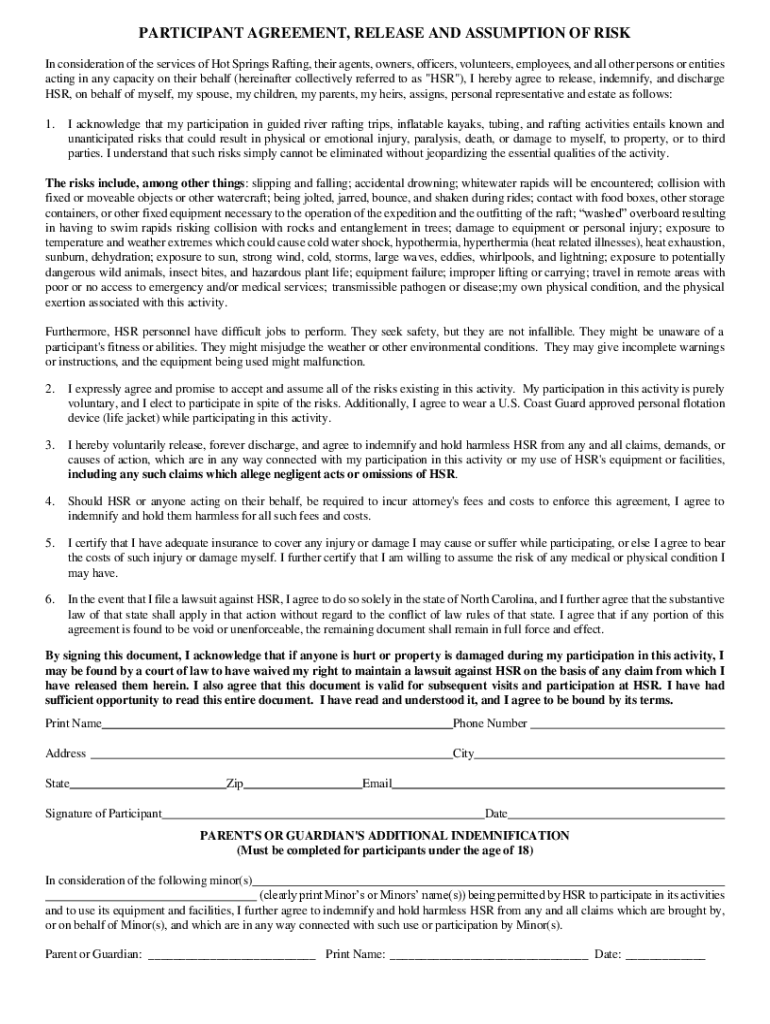 PARTICIPANT AGREEMENT, RELEASE AND ASSUMPTION OF RISK In consideration of the services of Hot Springs Rafting, their agents, owners, officers, volunteers, employees, and all other persons or entities