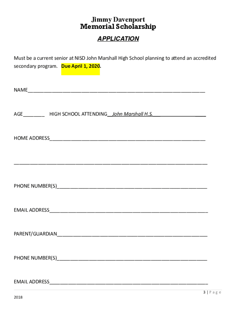 Jimmy Davenport Memorial Scholarship APPLICATION Must be a current senior at GISD John Marshall High School planning to a:end an accredited secondary program. Due April 1, 2020.NAME___AGE___ HIGH