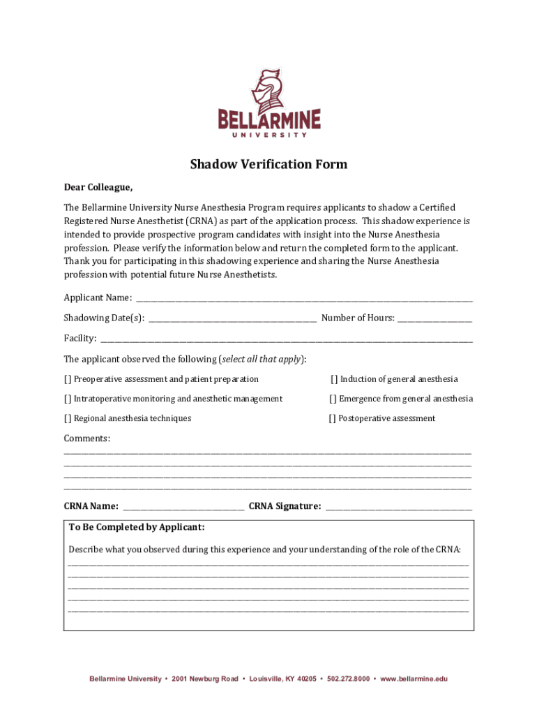 Shadow Verification Former Colleague, The Melamine University Nurse Anesthesia Program requires applicants to shadow a CertifiedRegistered Nurse Anesthetist (CRNA) as part of the application process.
