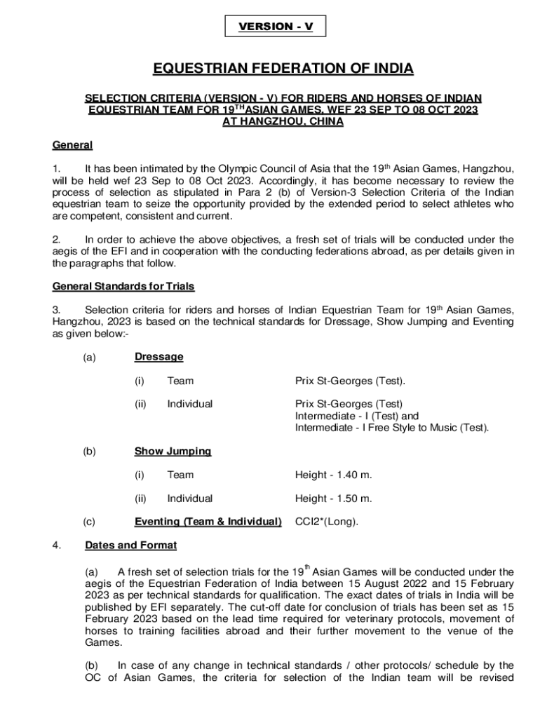 VERSION EQUESTRIAN FEDERATION OF INDIA SELECTION CRITERIA (VERSION V) FOR RIDERS AND HORSES OF INDIAN EQUESTRIAN TEAM FOR 19THASIAN GAMES, WE 23 SEP TO 08 OCT 2023 AT HANGZHOU, CHINA General 1. It