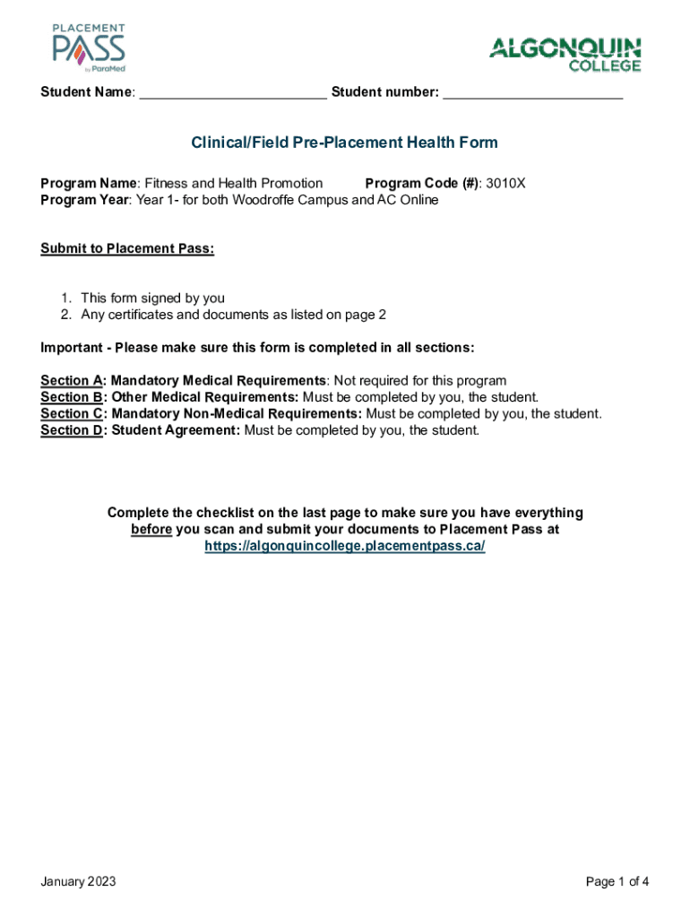 Student Name: ___ Student number: ___Clinical/Field Replacement Health Form Program Name: Fitness and Health Promotion Program Code (#): 3010X Program Year: Year 1 for both Woodruff Campus and AC