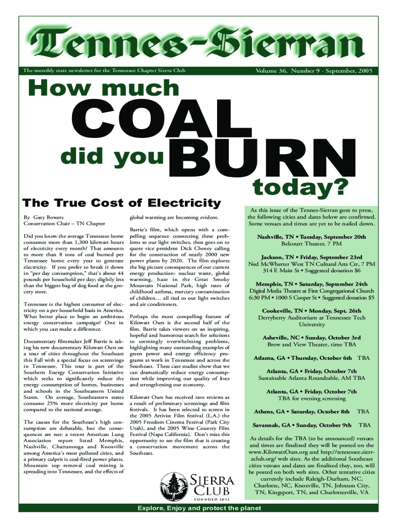 COAL did you BURN today? How much4HE MONTHLY STATE NEWSLETTER FOR THE 4ENNESSEE #CHAPTER 3IERRA #Subtle True Cost of Electricity By Gary Bowers Conservation Chair TN Chapter global warming are becoming