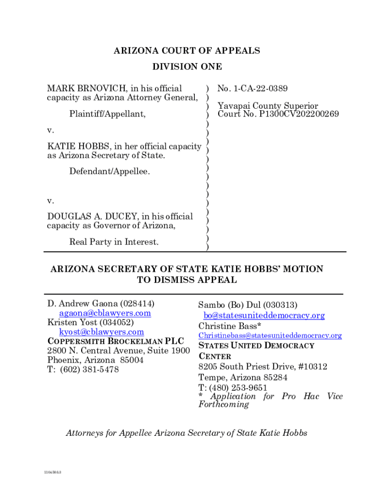 ARIZONA COURT OF APPEALS DIVISION ONE MARK NOVICE, in his official) No. 1CA220389 capacity as Arizona Attorney General, ) ) Yavapai County Superior Plaintiff/Appellant, ) Court No. P1300CV202200269)