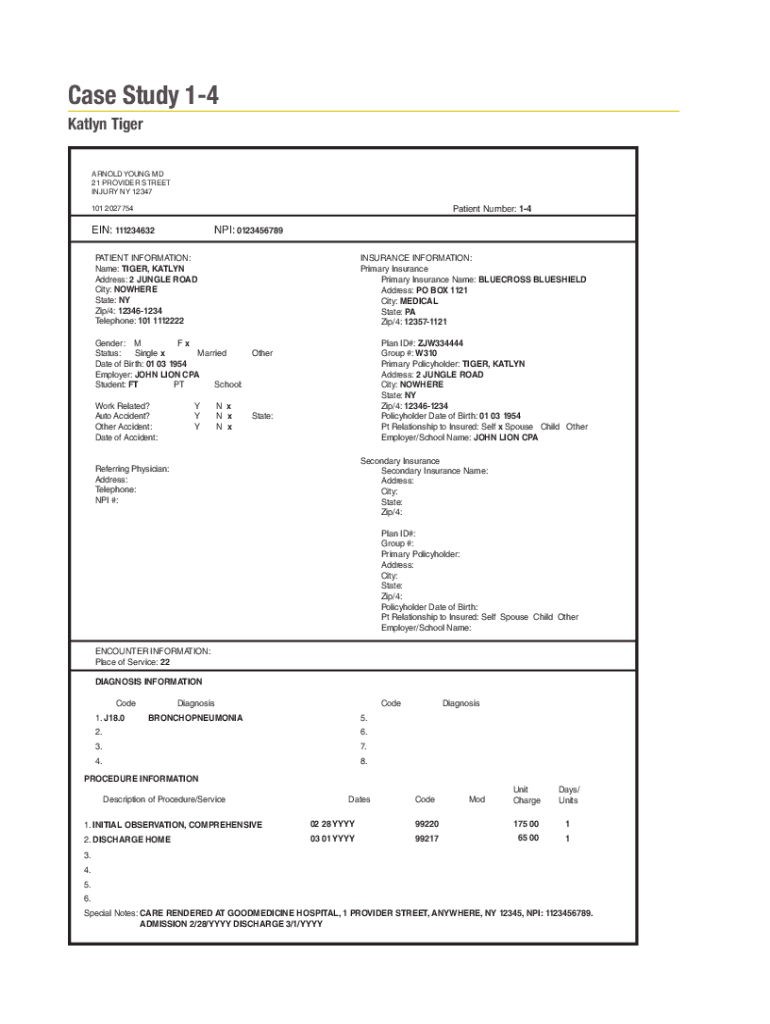 SimClaimTM Case Studies: Set One Case Study 14 Katelyn Tiger ARNOLD YOUNG MD 21 PROVIDER STREET INJURY NY 12347Patient Number: 14101 2027754EIN: 111234632NPI: 0123456789PATIENT INFORMATION: Name: