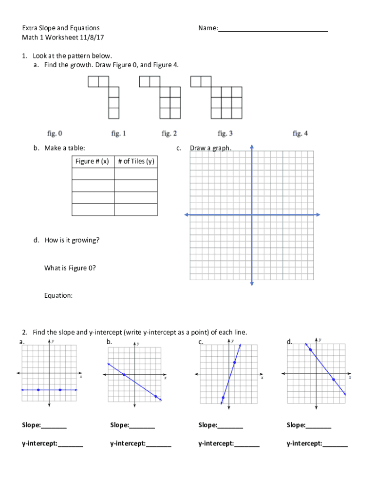 ExtraSlopeandEquations Name:___ Math1Worksheet11/8/17 1. Lookatthepatternbelow.a. Findthegrowth. DrawFigure0,andFigure4.b. Marketable: c