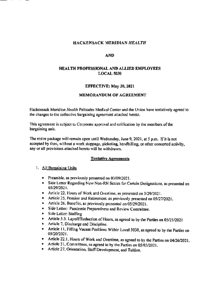 This Agreement made on May 30, 2021, by and between PALISADES MEDICAL CENTER,