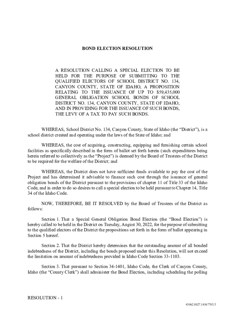 BOND ELECTION RESOLUTION CALLING A SPECIAL ELECTION TO BE HELD FOR THE PURPOSE OF SUBMITTING TO THE QUALIFIED ELECTORS OF SCHOOL DISTRICT NO. 134, CANYON COUNTY, STATE OF IDAHO, A PROPOSITION RELATING