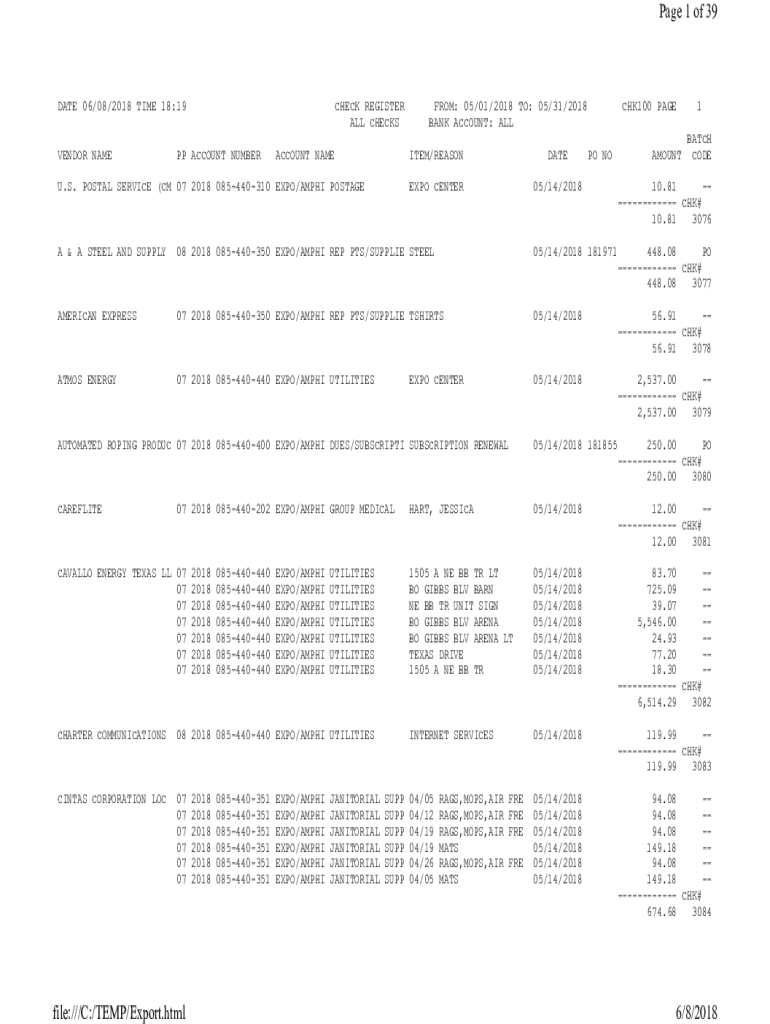 ALL CHECK SPP ACCOUNT NUMBERACCOUNT NAME. S. POSTAL SERVICE (CM 07 2018 085440310 EXPO/AM PHI POSTAGEFROM: 05/01/2018 TO: 05/31/2018