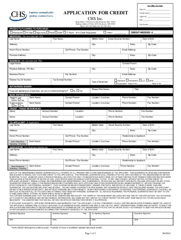 For Office Use Only Patron # ___APPLICATION FOR CREDITCredit Limit $___ Approval ___CHS Inc. Date ___Main Office: 1740 3rd Ave SE | Rochester, MN 55904 Mailing Address: PO Box 6878 | Rochester, MN