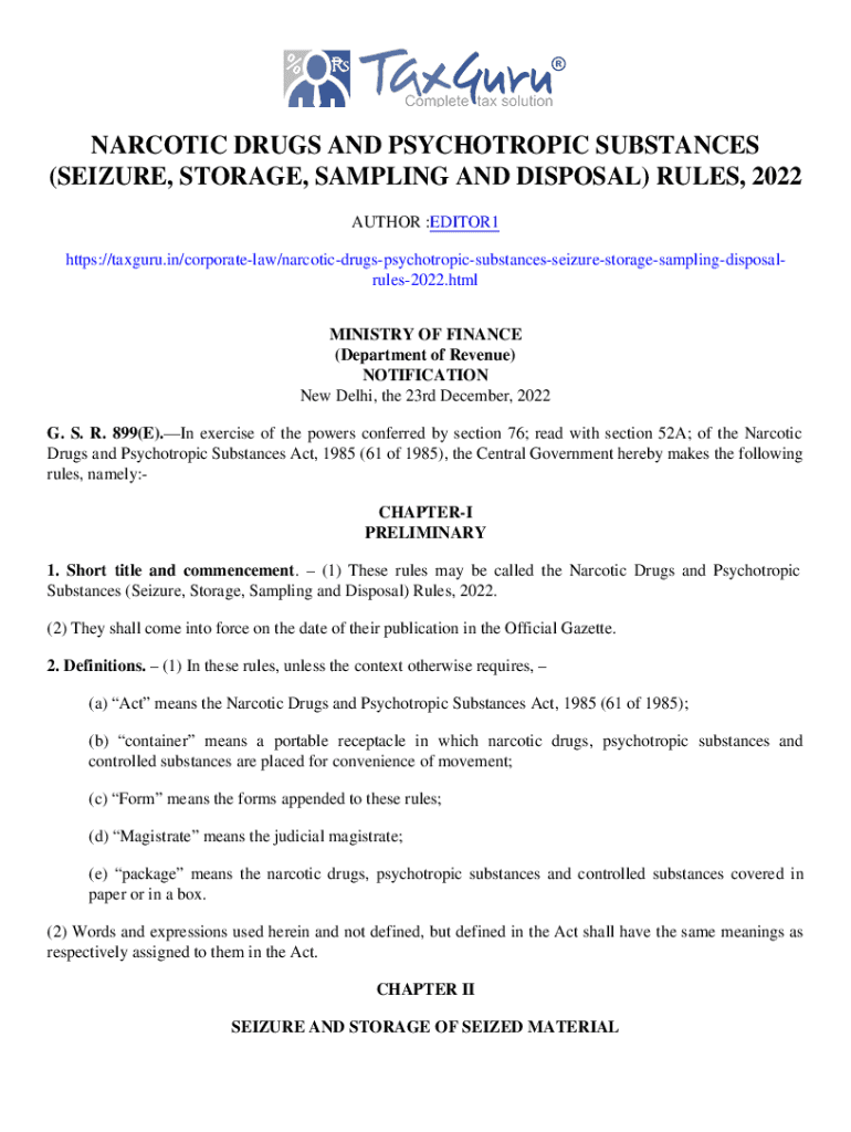 NARCOTIC DRUGS AND PSYCHOTROPIC SUBSTANCES (SEIZURE, STORAGE, SAMPLING AND DISPOSAL) RULES, 2022 AUTHOR :EDITOR1 https://taxguru.in/corporatelaw/narcoticdrugspsychotropicsubstancesseizurestoragesamplingdisposalrules2022.html