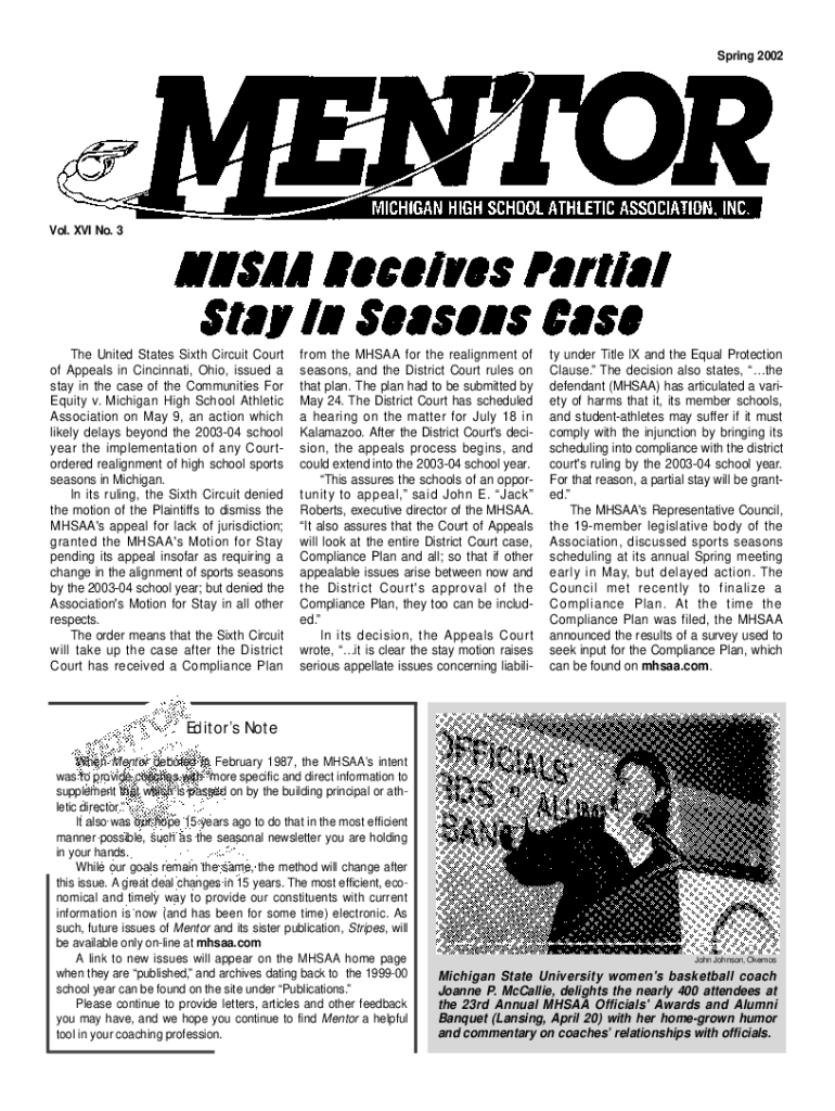 Spring 2002Vol. XVI No. 3The United States Sixth Circuit Court of Appeals in Cincinnati, Ohio, issued a stay in the case of the Communities For Equity v. Michigan High School Athletic Association