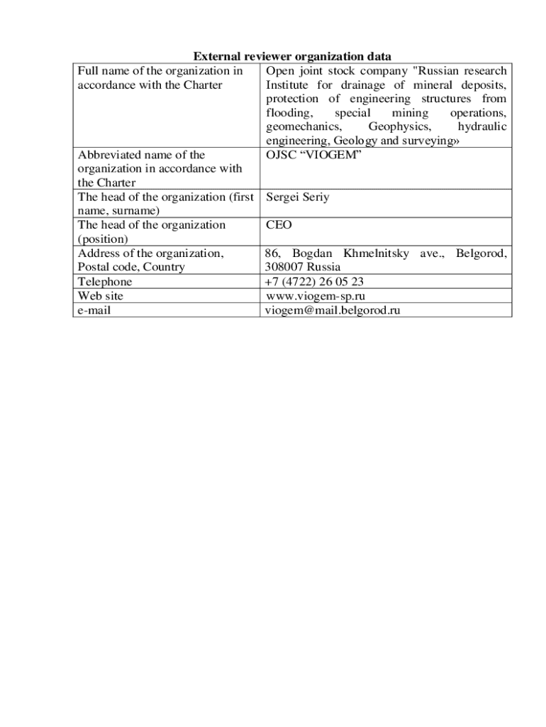 External reviewer organization data Full name of the organization in Open joint stock company \” Russian research accordance with the Charter Institute for drainage of mineral deposits, protection