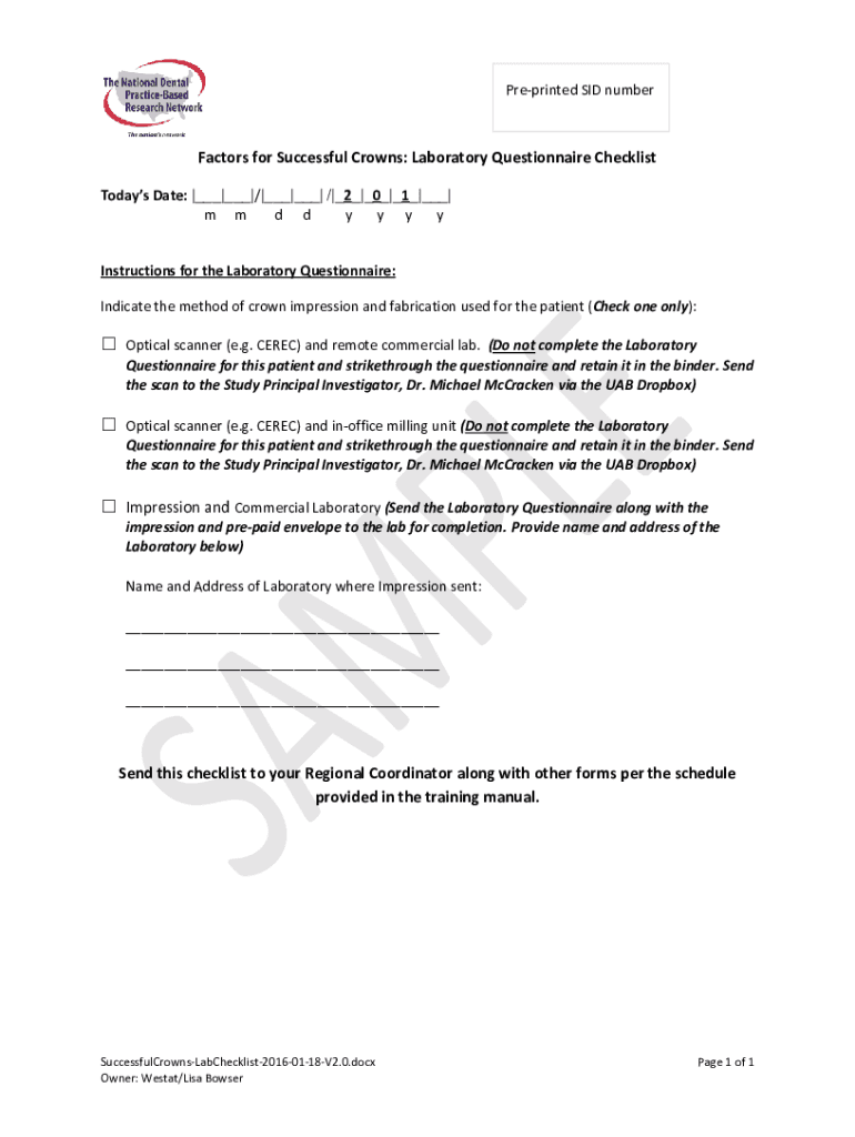 Preprinted SID numerators for Successful Crowns: Laboratory Questionnaire Checklist Today's Date: |___|___|/|___|___| /|_2_|_0_|_1_|___| m d d y y y instructions for the Laboratory Questionnaire: