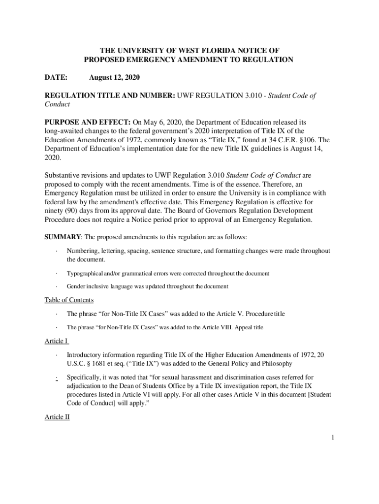 THE UNIVERSITY OF WEST FLORIDA NOTICE OF PROPOSED EMERGENCY AMENDMENT TO REGULATION DATE:August 12, 2020REGULATION TITLE AND NUMBER: WWF REGULATION 3.010 Student Code of Conduct PURPOSE AND EFFECT: