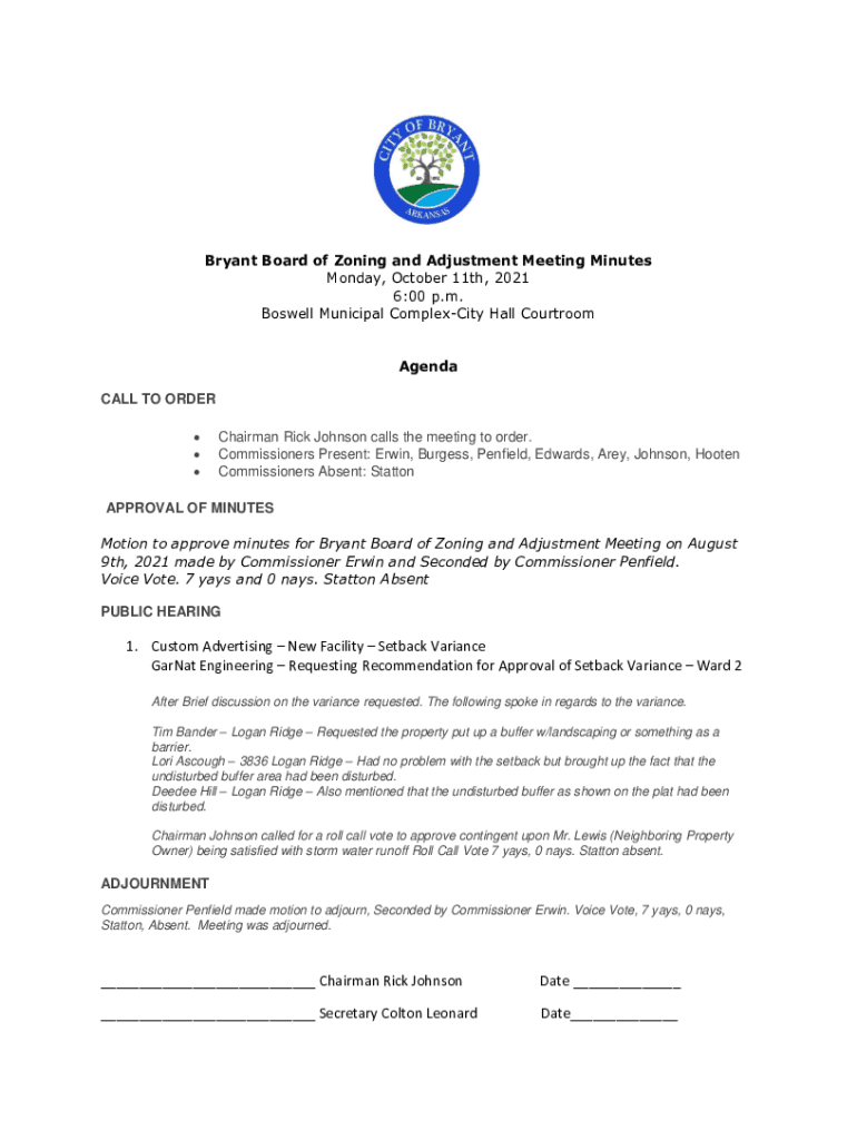 Bryant Board of Zoning and Adjustment Meeting Minutes Monday, October 11th, 2021 6:00 p.m. Boswell Municipal Complexity Hall Courtroom Agenda CALL TO ORDER. Chairman Rick Johnson calls the meeting