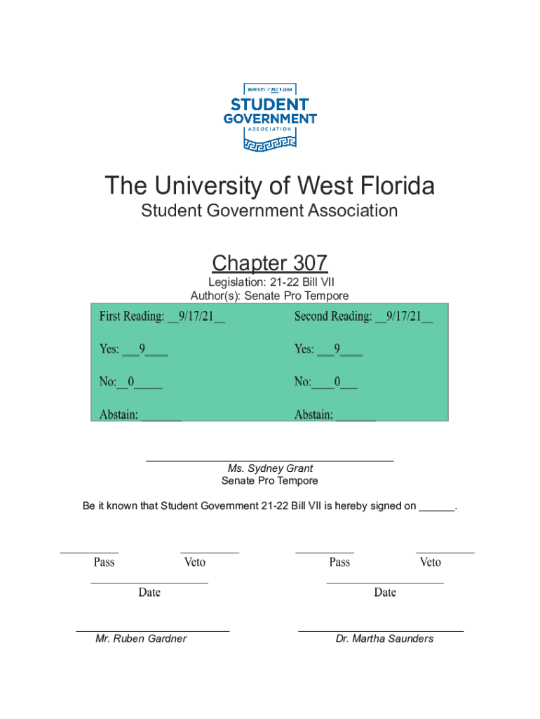 The University of West Florida Student Government AssociationChapter 307 Legislation: 2122 Bill VII Author(s): Senate Pro Tempore___ Ms. Sydney Grant Senate Pro Tempore Be it known that Student Government