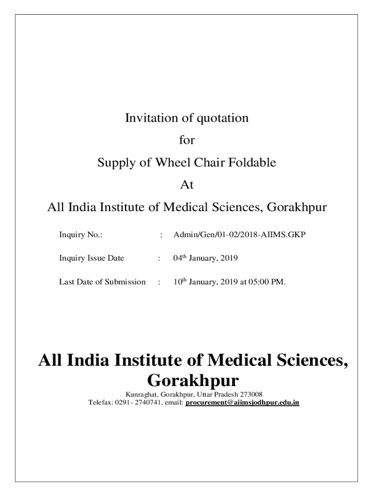 Invitation of quotation for Supply of Wheelchair Foldable At All India Institute of Medical Sciences, Gorakhpur Inquiry No.::Admin/Gen/0102/2018AIIMS. Inquiry Issue Date:04th January, 2019Last Date