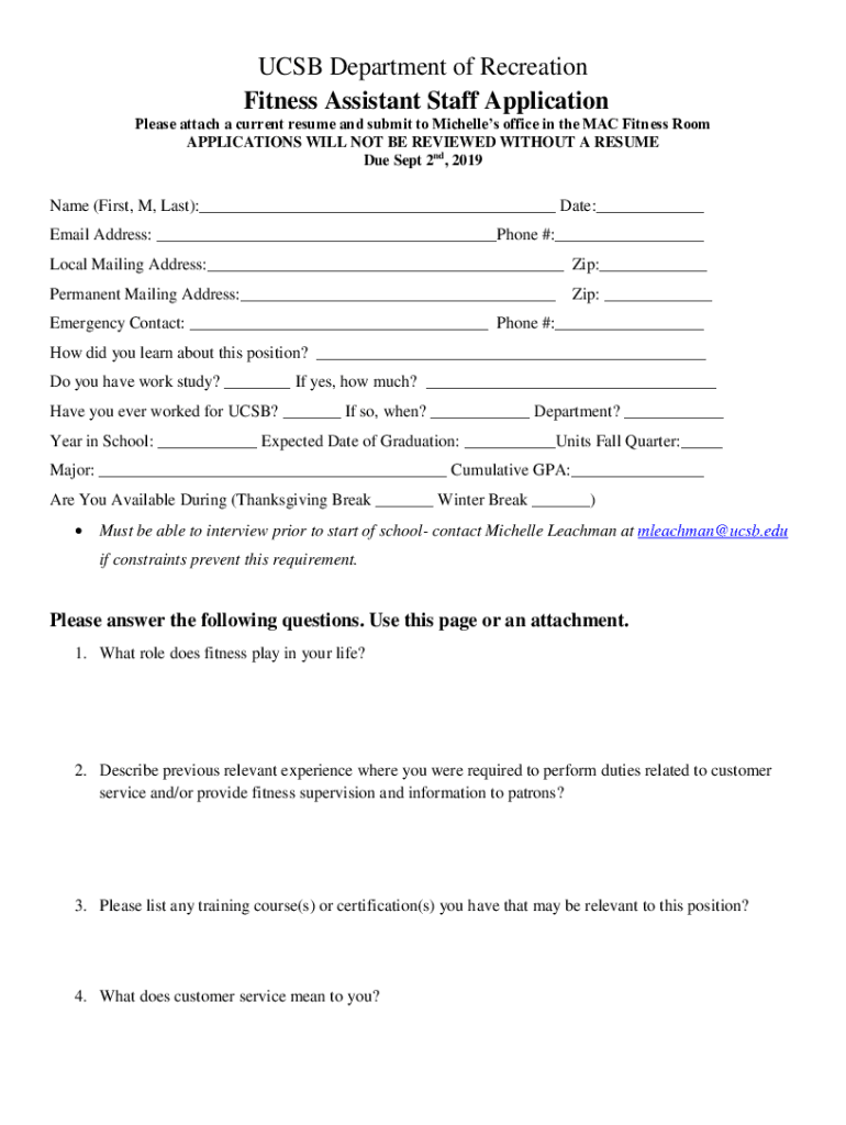 UCSB Department of Recreation Fitness Assistant Staff Application Please attach a current resume and submit to Michelle's office in the MAC Fitness Room APPLICATIONS WILL NOT BE REVIEWED WITHOUT A