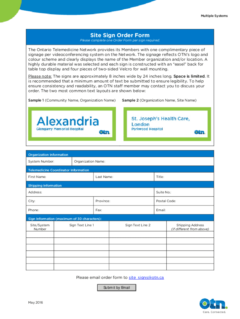 Multiple Systematize Sign Order Formulas complete one Order Form per sign required. The Ontario Telemedicine Network provides its Members with one complimentary piece of signage per videoconferencing