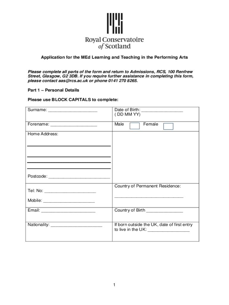 Application for the Med Learning and Teaching in the Performing Displease complete all parts of the form and return to Admissions, RCS, 100 Renfrew
