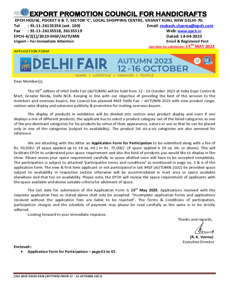 EXPORT PROMOTION COUNCIL FOR HANDICRAFTS EACH HOUSE, POCKET 6 & 7, SECTOR C, LOCAL SHOPPING Center, VACANT KU NJ, NEW DELHI70. Tel : 911126135256 (ext. 109) Email: mukesh.sharma@epch.com Fax : 911126135518,