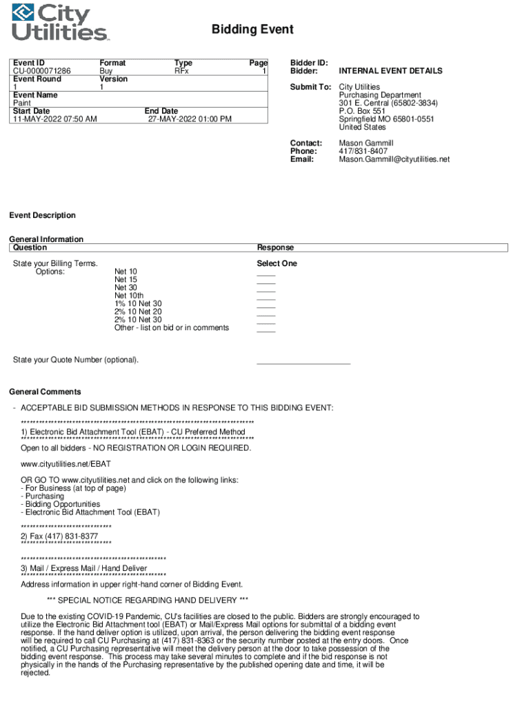 Bidding Event ID CU0000071286 Event Round 1 Event Name Paint Start Date 11MAY2022 07:50 Format Buy Version 1Type Rampage 1Bidder ID: Bidder:INTERNAL EVENT DETAILSSubmit To:City Utilities Purchasing