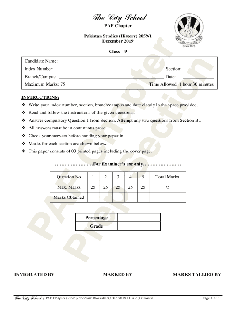 The City School PAF Chapter Pakistan Studies (History) 2059/1 December 2019 Class 9 Candidate Name: ___ Index Number: ___ Section: ___ Branch/Campus: ___ Date: Maximum Marks: 75___Time Allowed: 1