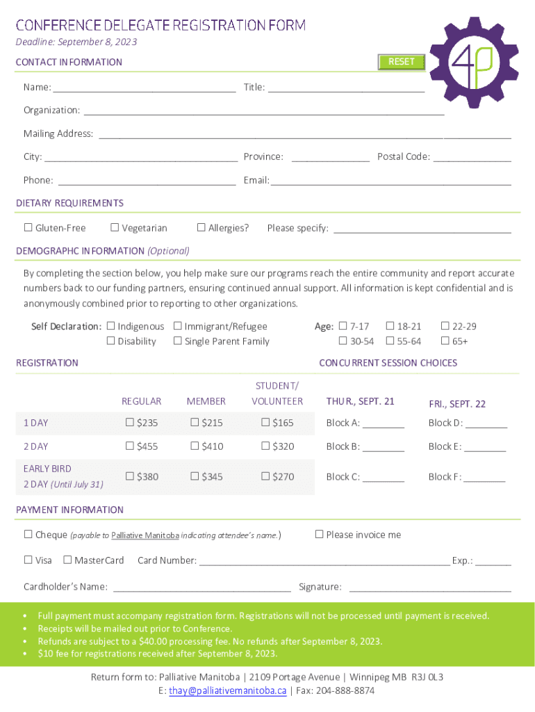 Deadline: September 8, 2023, RECONTACT Informational: ___ Title: ___ Organization: ___ Mailing Address: ___ City: ___ Province: ___ Postal Code: ___ Phone: ___ Email: ___ DIETARY REQUIREMENTS Gluten-free