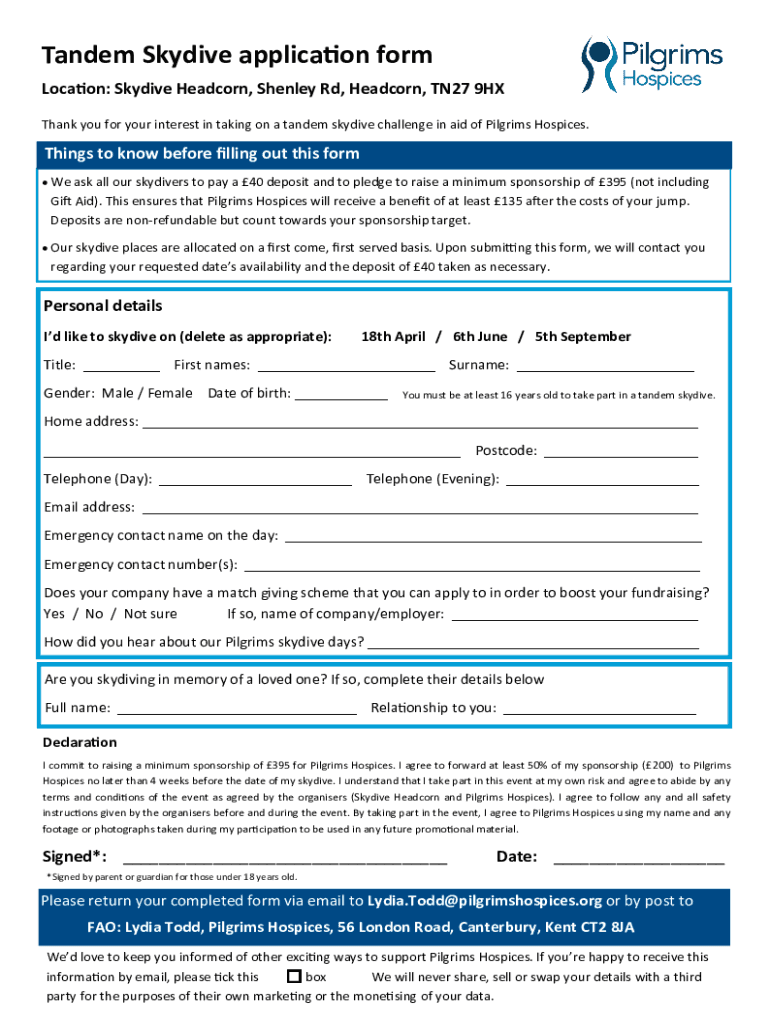 Tandem Skydive application form Location: Skydive Head corn, Sheila Rd, Head corn, TN27 9HX Thank you for your interest in taking on a tandem skydive challenge in aid of Pilgrims Hospices. Things