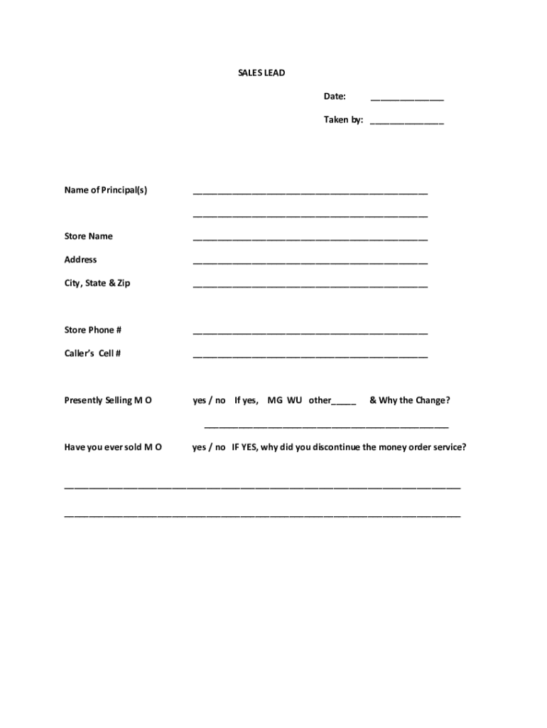 SALES LEAD Date:___Taken by: ___Name of Principal(s)___ ___Store Name___Address___City, State & Zip___Store Phone #___Callers Cell #___Presently Selling MO yes / no If yes, MG WU other___& Why the