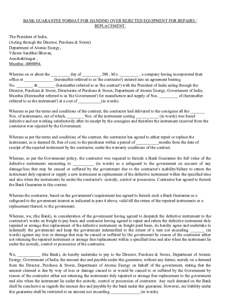BANK GUARANTEE FORMAT FOR HANDING OVER REJECTED EQUIPMENT FOR REPAIRS / REPLACEMENT. The President of India, (Acting through the Director, Purchase & Stores) Department of Atomic Energy, Viral Sarah