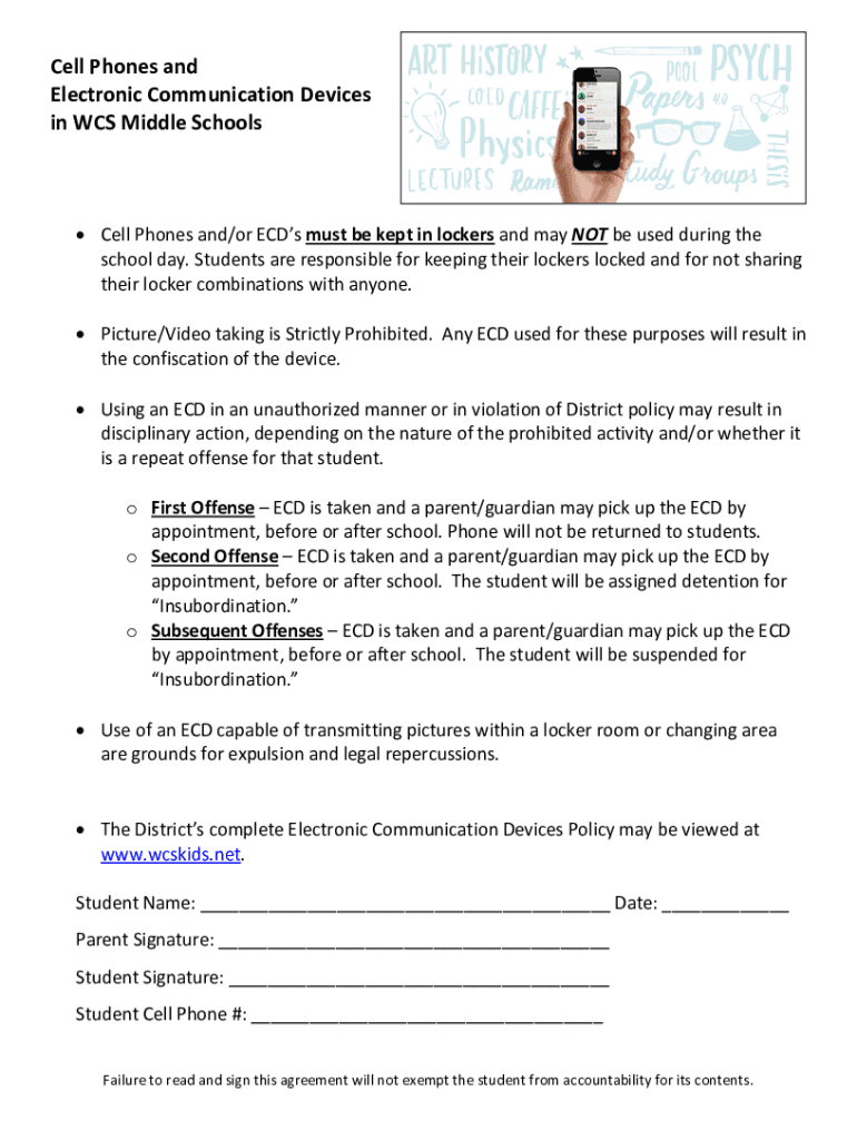 Cell Phones and Electronic Communication Devices in WCS Middle Schools Cell Phones and/or ECDs must be kept in lockers and may NOT be used during the school day. Students are responsible for keeping