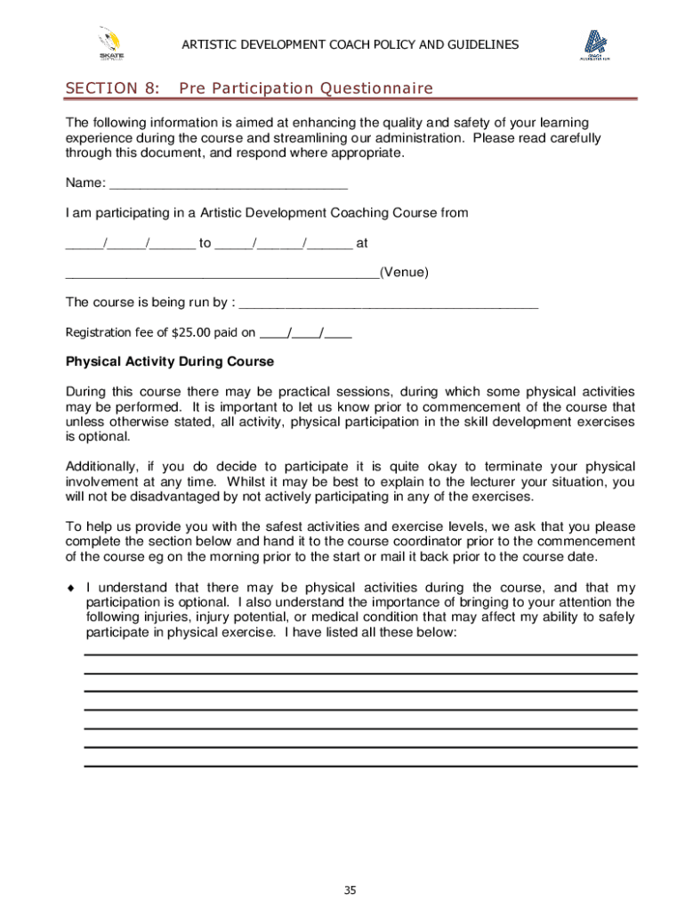 ARTISTIC DEVELOPMENT COACH POLICY AND GUIDELINESSECTION 8:PRE Participation Questionnaire following information is aimed at enhancing the quality and safety of your learning