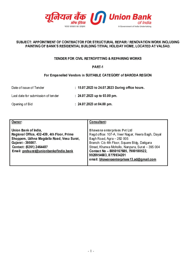 SUBJECT: APPOINTMENT OF CONTRACTOR FOR STRUCTURAL REPAIR / RENOVATION WORK INCLUDING PAINTING OF BANKS RESIDENTIAL BUILDING WITHAL HOLIDAY HOME, LOCATED AT VAL SAD. TENDER FOR CIVIL RETROFITTING &