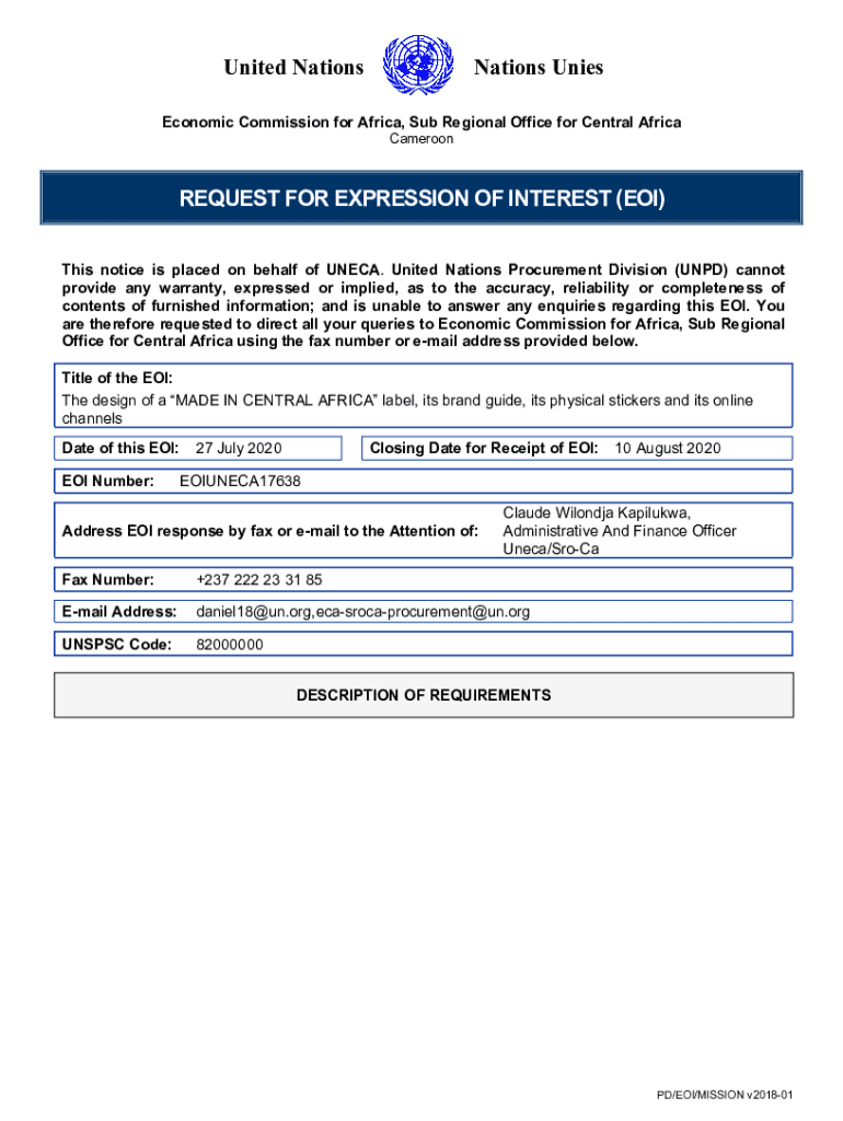 United NationsNations Uneconomic Commission for Africa, Sub Regional Office for Central Africa CameroonREQUEST FOR EXPRESSION OF INTEREST (EOI) This notice is placed on behalf of UN ECA. United Nations