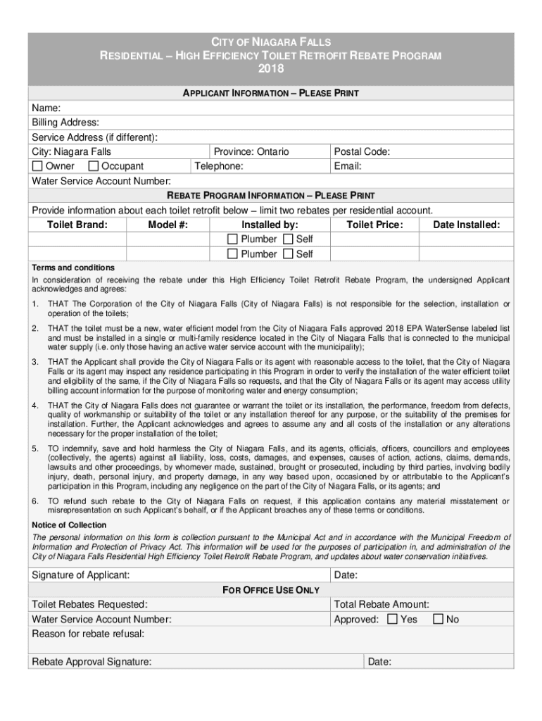 CITY OF NIAGARA FALLS RESIDENTIAL HIGH EFFICIENCY TOILET RETROFIT REBATE PROGRAM 2018 APPLICANT INFORMATION PLEASE PRINT Name: Billing Address: Service Address (if different): City: Niagara Falls