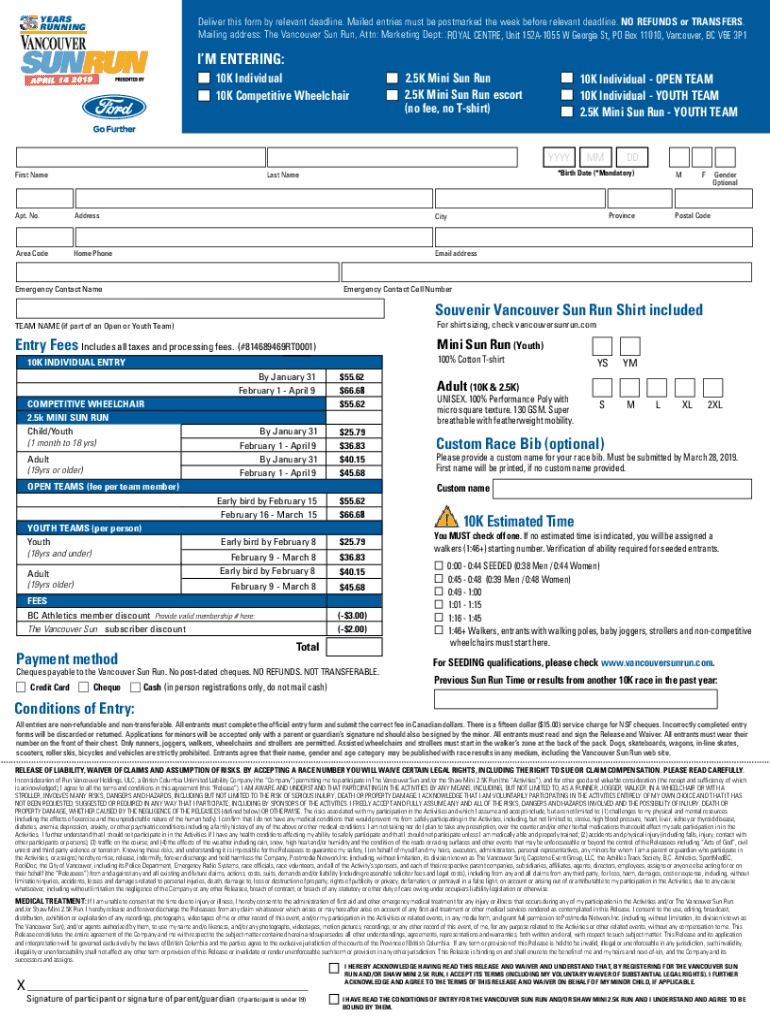 YEARS RUNNINGDeliver this form by relevant deadline. Mailed entries must be postmarked the week before relevant deadline. NO REFUNDS or TRANSFERS. Mailing address: The Vancouver Sun Run, Attn: Marketing