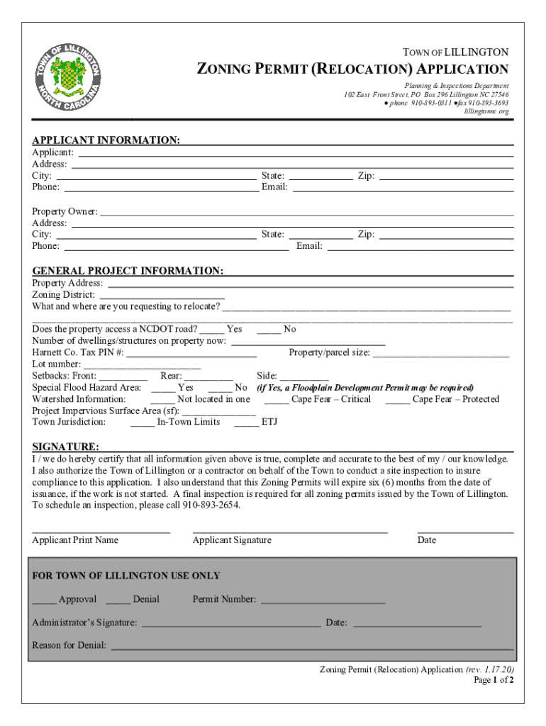 TOWN OF LILLINGTONZONING PERMIT (RELOCATION) APPLICATION Planning & Inspections Department 102 East Front Street, PO Box 296 Billington NC 27546 phone 9108930311 fax 9108933693 Billington. Applicant