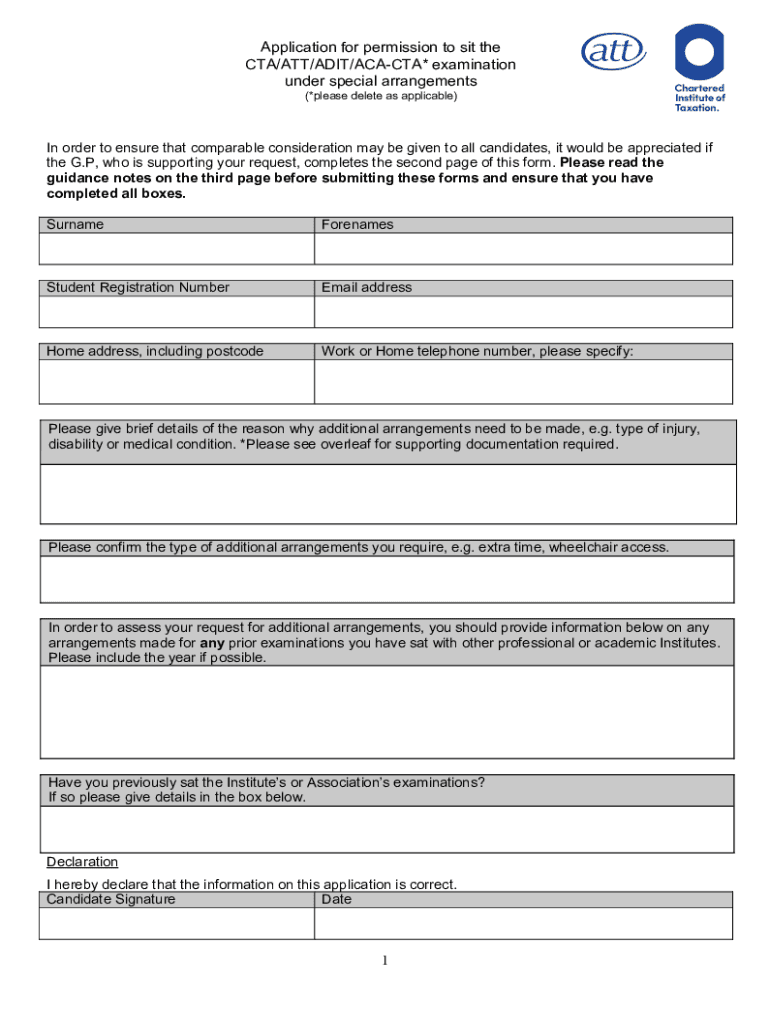 Application for permission to sit the CTA/ATT/ADMIT/ACACIA* examination under special arrangements (*please delete as applicable)In order to ensure that comparable consideration may be given to all