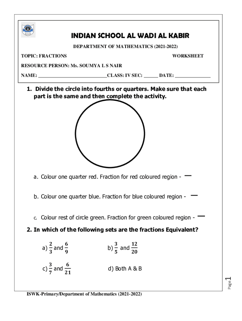 INDIAN SCHOOL AL WADI AL AIR DEPARTMENT OF MATHEMATICS (20212022) TOPIC: FRACTIONSWORKSHEETRESOURCE PERSON: Ms. SOU MYA L S NAIR NAME: ___CLASS: IV SEC: ___ DATE: ___1. Divide the circle into fourths