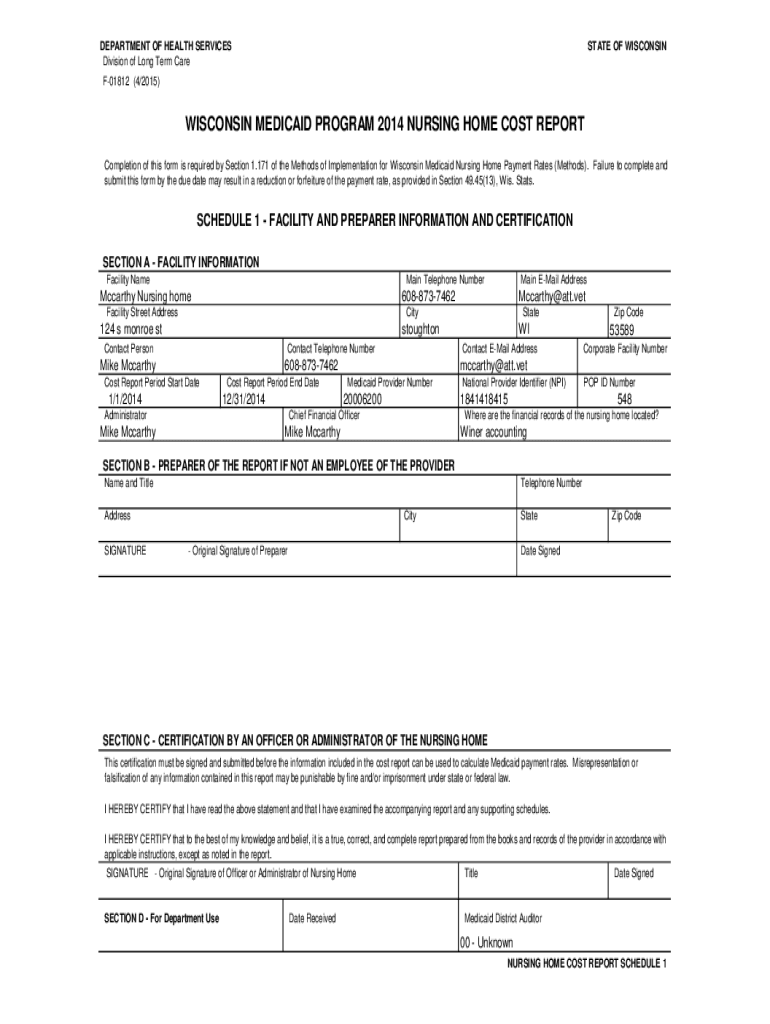 DEPARTMENT OF HEALTH SERVICES Division of Long Term Reinstate OF WISCONSINF01812 (4/2015)WISCONSIN MEDICAID PROGRAM 2014 NURSING HOME COST REPORT Completion of this form is required by Section 1.171
