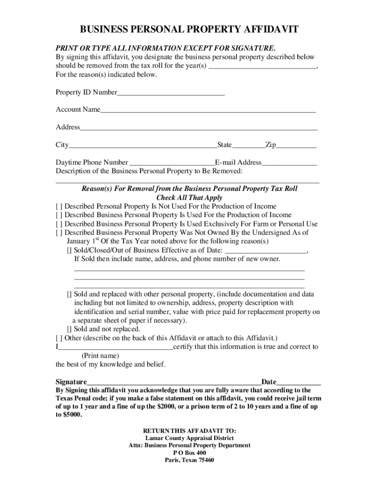 BUSINESS PERSONAL PROPERTY AFFIDAVIT PRINT OR TYPE ALL INFORMATION EXCEPT FOR SIGNATURE. By signing this affidavit, you designate the business personal property described below should be removed from