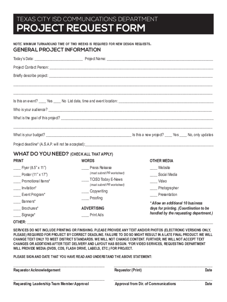 TEXAS CITY ISD COMMUNICATIONS DEPARTMENTPROJECT REQUEST FORM note: minimum turnaround time of two weeks is required for new DESIGN requests. GENERAL PROJECT INFORMATIONTodays Date: ___ Project Name: