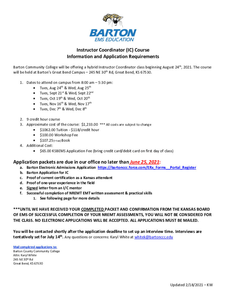 Instructor Coordinator (IC) Course Information and Application Requirements Barton Community College will be offering a hybrid Instructor Coordinator class beginning August 24th, 2021. The course