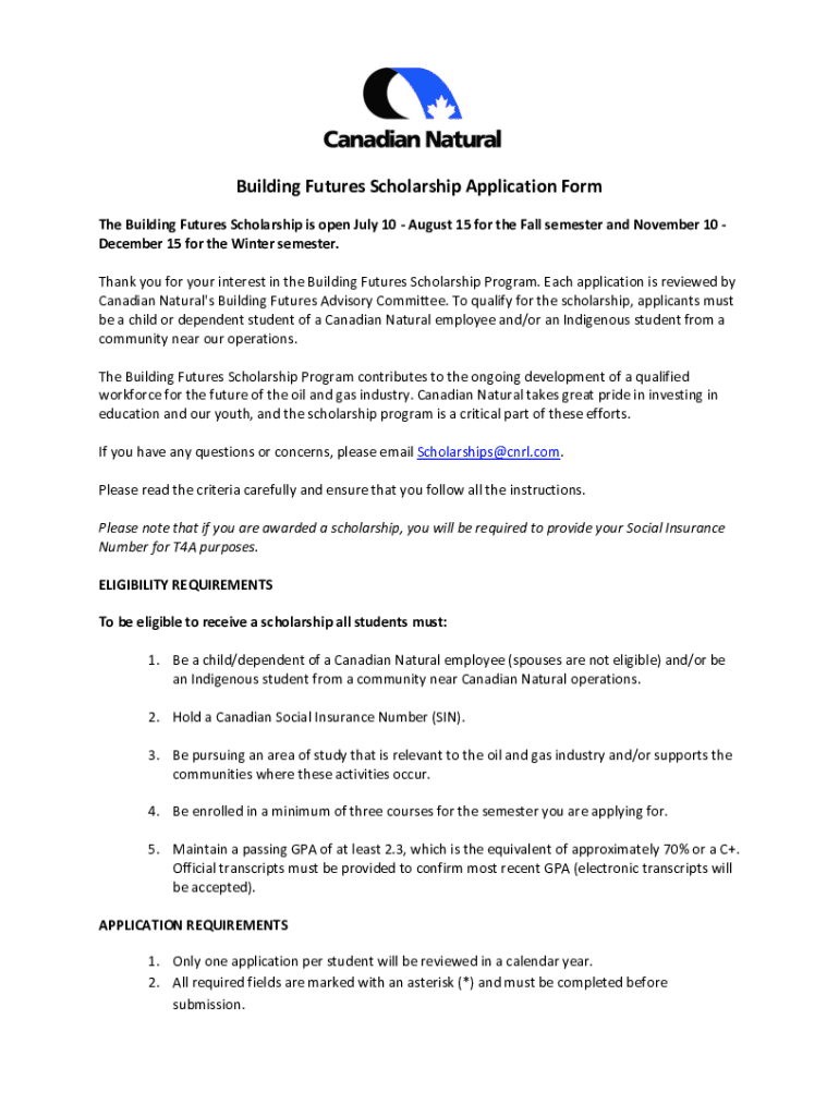 Building Futures Scholarship Application Form The Building Futures Scholarship is open July 10 August 15 for the Fall semester and November 10 December 15 for the Winter semester. Thank you for your
