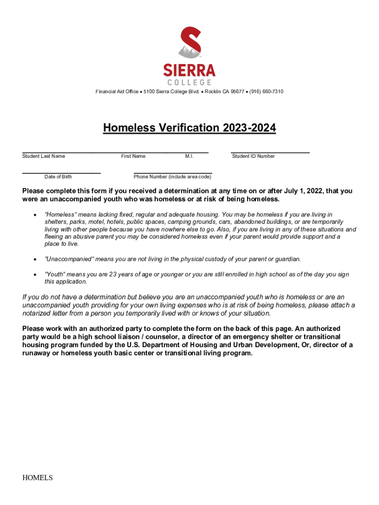 Financial Aid Office 5100 Sierra College Blvd. Rocking CA 95677 (916) 6607310Homeless Verification 20232024 ___ Student Last Name___ Date of Birthright Name. I.___ Student ID Number___ Phone Number