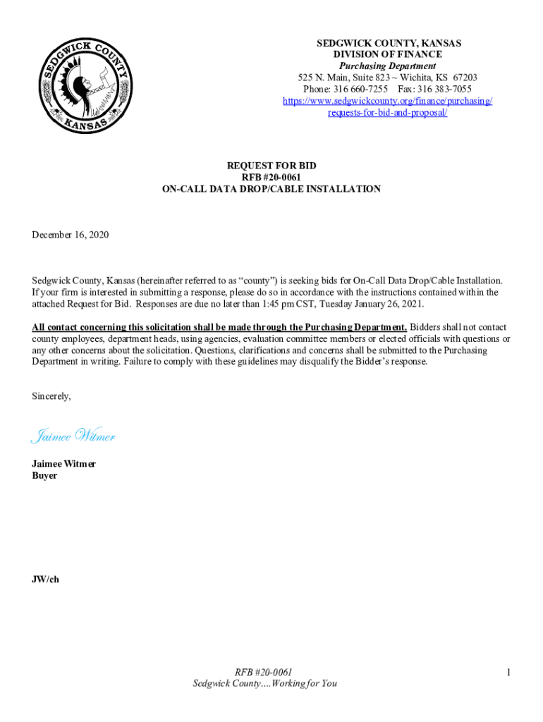SEDGWICK COUNTY, KANSAS DIVISION OF FINANCE Purchasing Department 525 N. Main, Suite 823 Wichita, KS 67203 Phone: 316 6607255 Fax: 316 3837055 https://www.sedgwickcounty.org/finance/purchasing/ requestsforbidandproposal/REQUEST