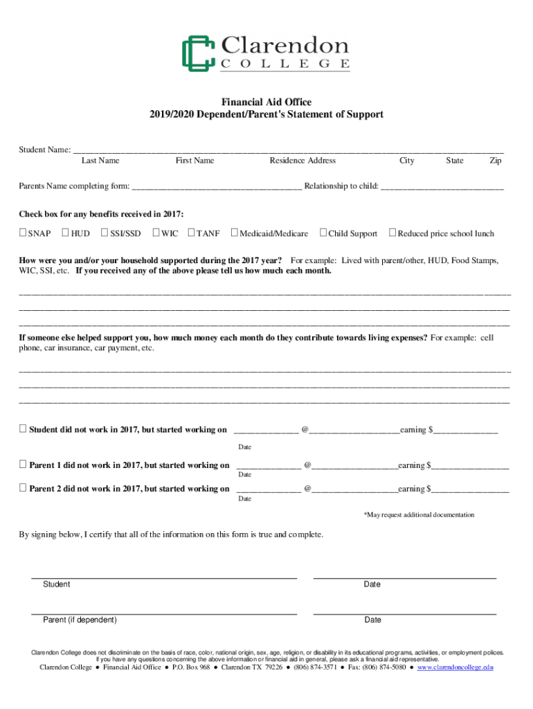 Financial Aid Office 2019/2020 Dependent/Parent\'s Statement of Support Student Name: ___ Last Name First Name Residence Address City State Zip Parents Name completing form: ___ Relationship to child: